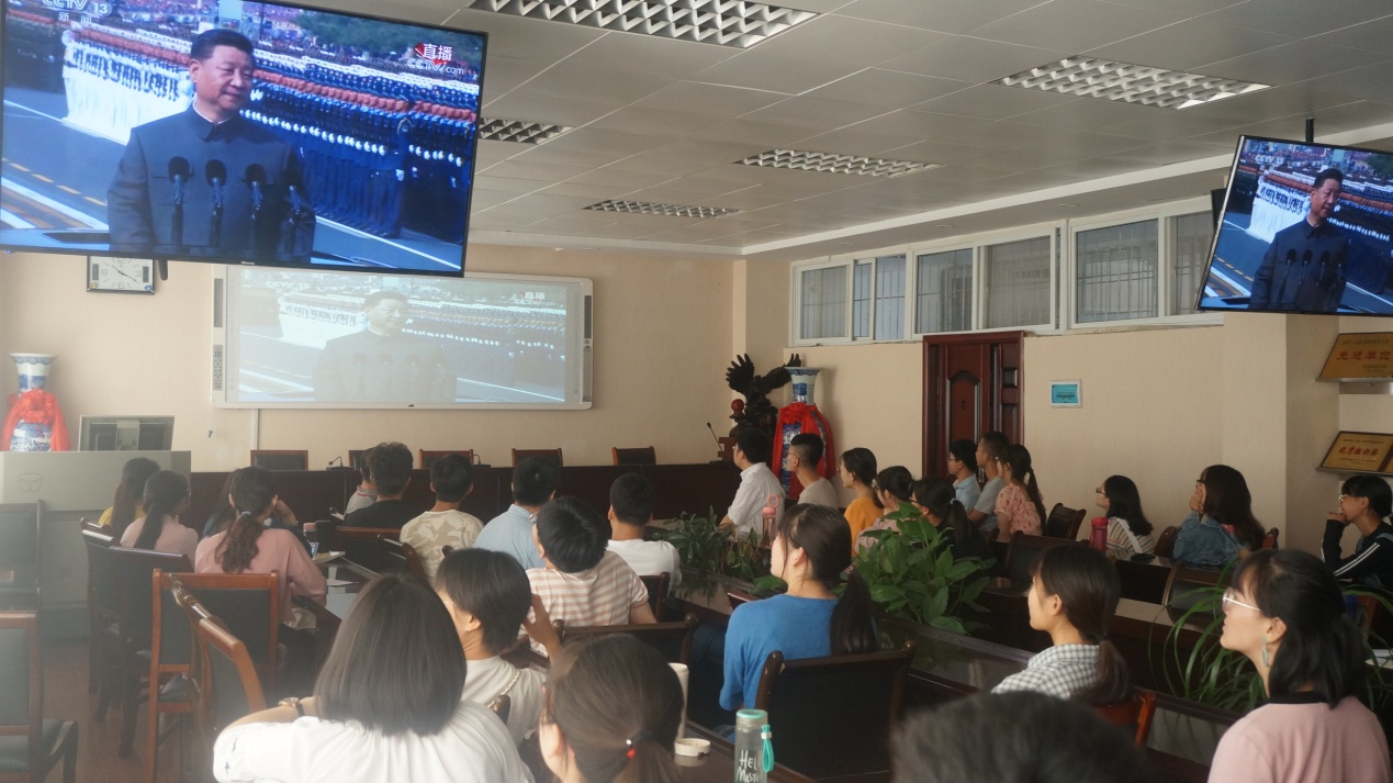 党委副书记吴志伟与学院全体学生党员在实验楼407会议室一同收听收看了大会、阅兵和群众游行实况。其他领导和返家师生分别集中收听收看了中华人民共和国成立70周年大会实况直播。大家认真聆听习近平总书记庆祝大会上所作重要讲话,集体感受现场震撼人心的阅兵仪式。