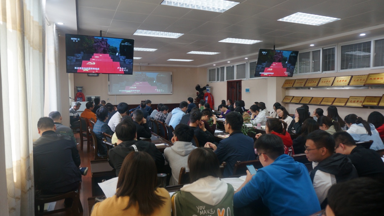 分党委在实验楼407会议室组织全体师生党员集中观看党建视频。