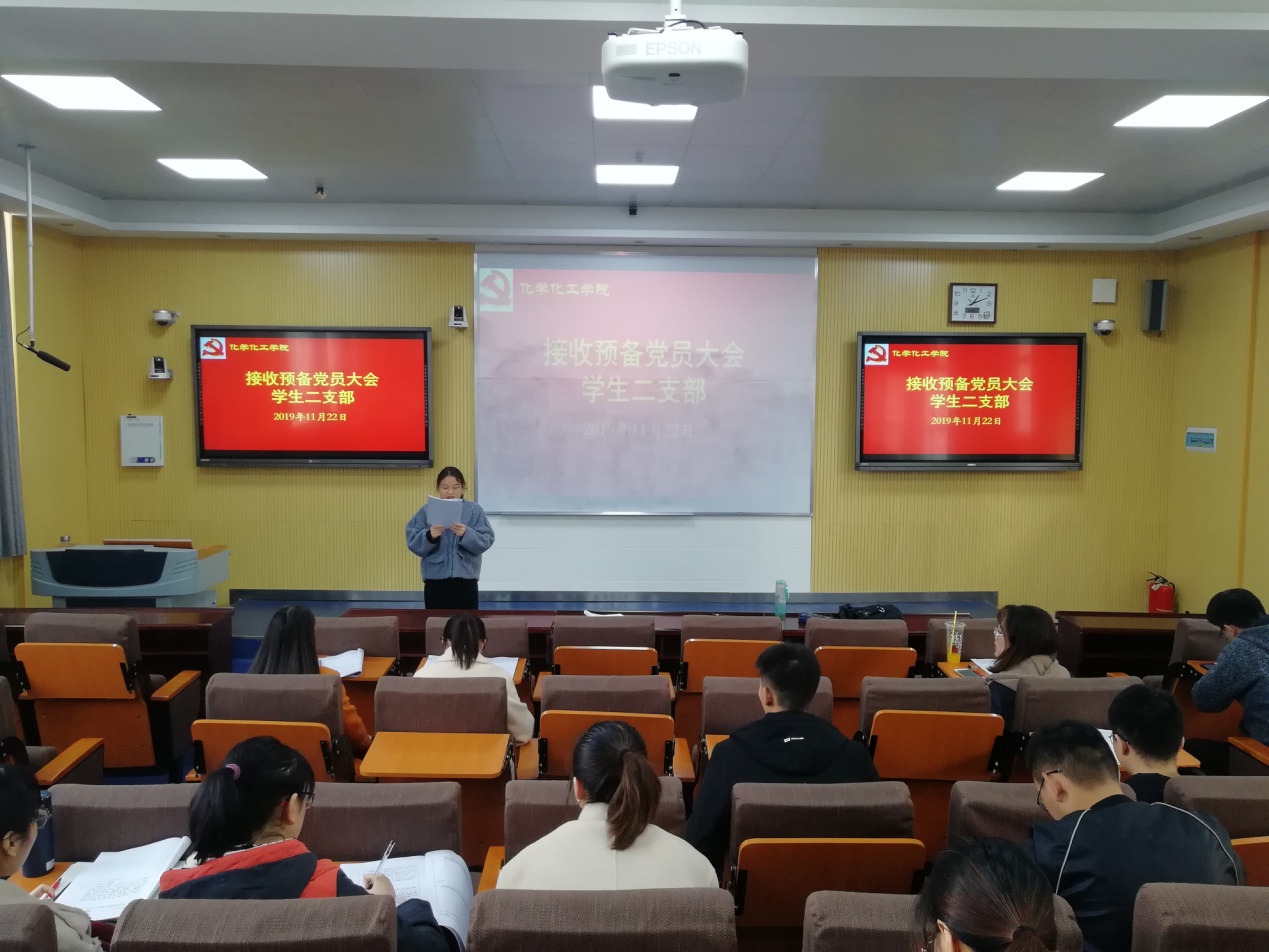 学生第二党支部在教四楼T2室召开预备党员接收支部大会。第二党支部孟瑞芳同志主持本次会议。