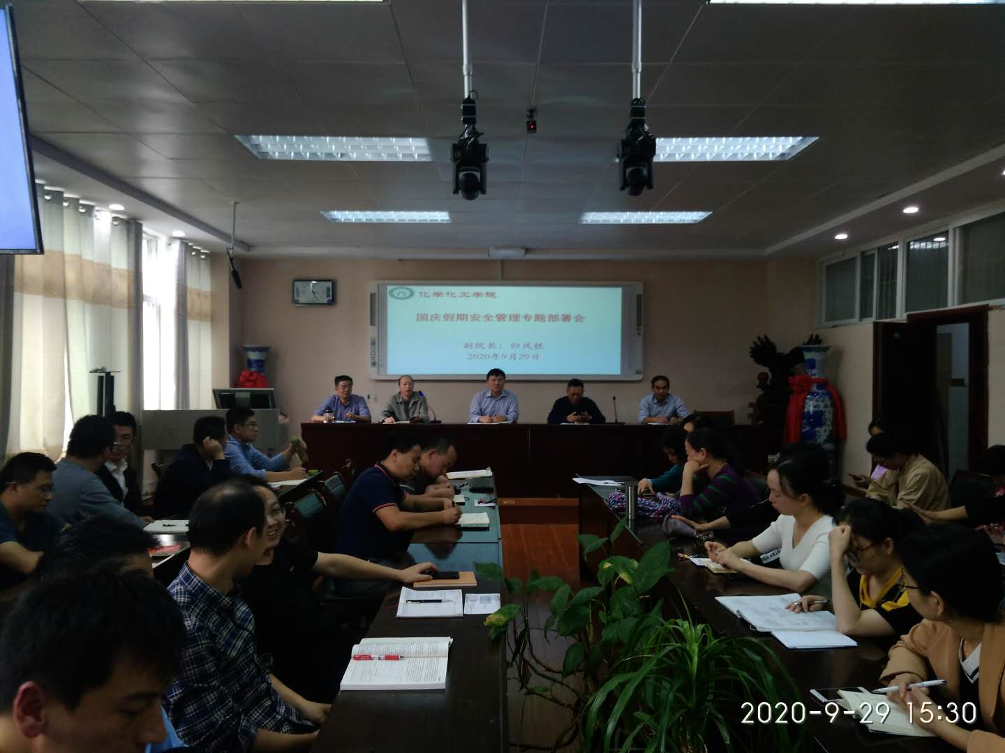在化学实验楼407会议室召开国庆节安全稳定工作专题部署会。学院领导班子及全体教师出席了会议,会议由学院党委书记郭鹏主持。