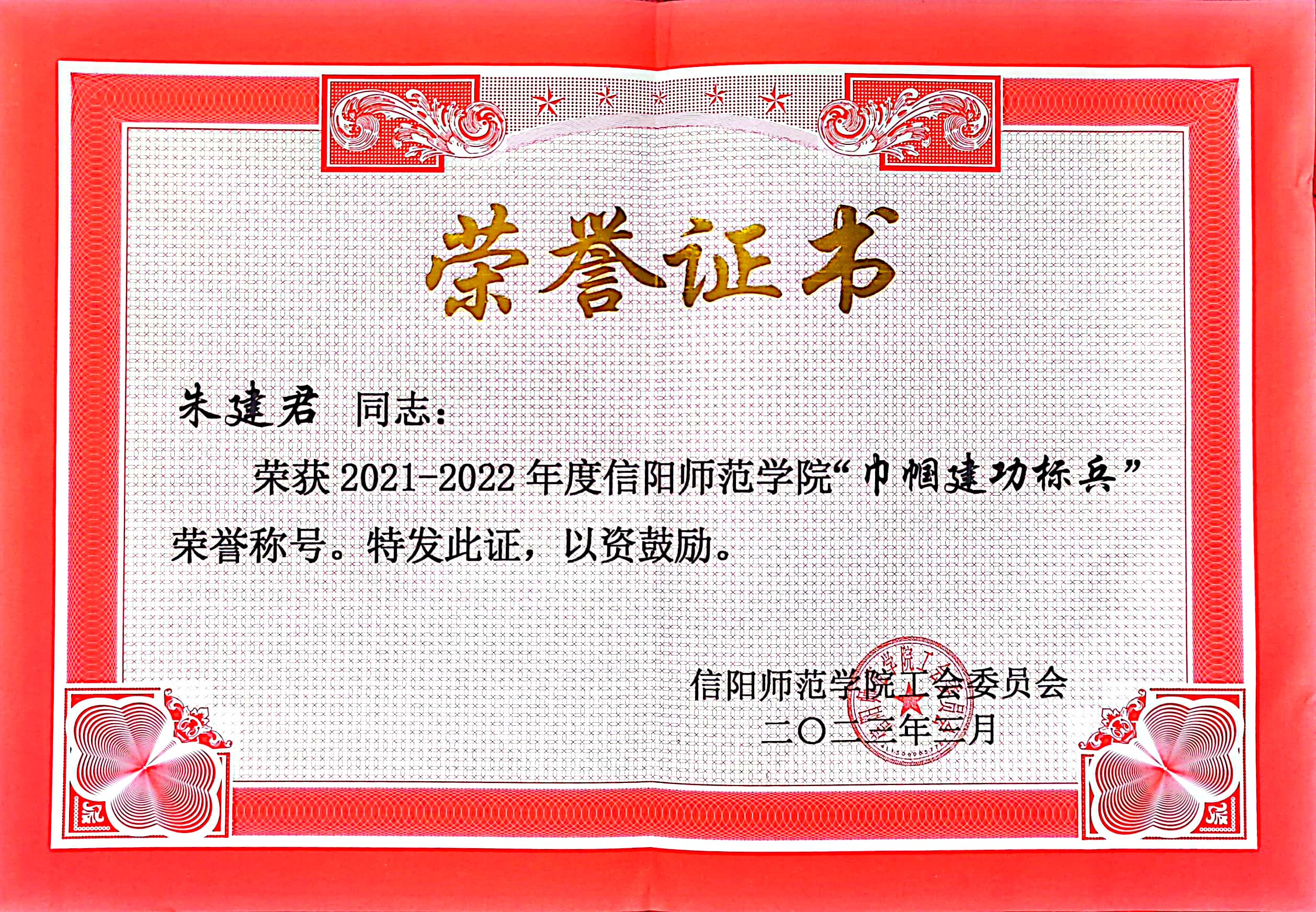 女教职工朱建君博士被授予“巾帼建功标兵”荣誉称号。