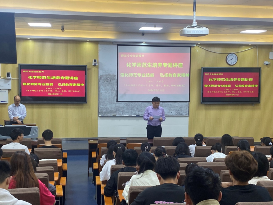 为强化师范生的教师职业理想与职业信念,进一步提升师范生职业素养,5月11日上午,成人小说 邀请华中师范大学硕士生导师王世存博士在教四T-2开展“强化师范专业技能,弘扬教育家精神”专场报告。学院在读公费师范生150余人到现场聆听报告。报告会由成人小说 党委书记、化学学科教学专业学位硕士生导师郭鹏主持。