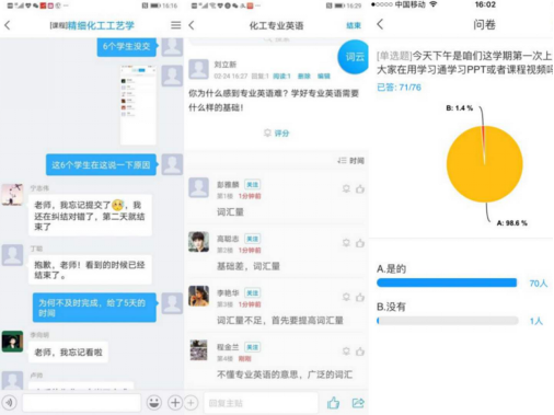 自2月中旬以来,全体教师充分利用网络教学平台与网上教学资源,精心设计课程的内容,采用速课、讨论互动、测验、课下作业等多种教学形式,积极开展了专业课教学。为了保证网络教学质量,上课期间,学院领导、教学管理人员和辅导员全程在线,随时准备处理突发情况,协助师生解决网络授课技术问题,在全体师生的共同努力下,化院线上教学秩序运行平稳、课堂教学规范、过程管理到位。