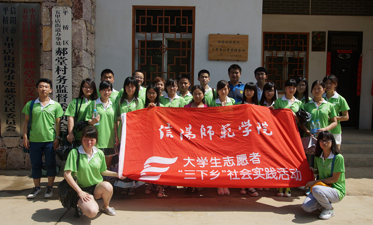 活动伊始,队员们整齐有序地来到郝堂村大学生社会实践基地。宋书记指出,信阳师范学院选择在郝堂建立大学生社会实践基地,是对郝堂社会主义新农村建设的大力支持,必将给郝堂村的发展带来生机和活力,同时也为大学生暑期社会实践提供了一个交流平台。她希望队员们能珍惜机会,认真学习,并把所学知识运用于实践,为社会服务。然后,各位队员在村民的带领下参观了郝堂村的特色村落建设,领略了郝堂村的自然风光。接着,实践分队通过走村入户的形式,咨询了当地村民种植农作物过程中对农药的使用情况。队员们了解到农户对农药的不当使用所导致的环境破坏认识略有不足,当地部分农户也并未接受过农药使用的相关培训和指导,对农药包装物的处理考虑的不够周全。志愿者们利用所学专业知识针对这些问题为农户提出了一些友好的建议。而后,志愿者们对路边的塑料袋、果皮、纸屑等垃圾进行相关处理,同时向当地村民、广大游客积极宣讲绿色低碳生态环保理念,号召他们爱护环境,保卫郝堂,为建设“美丽信阳”贡献自己的一份力量。活动结束后,分队全体成员在大学生社会实践基地合影留念。