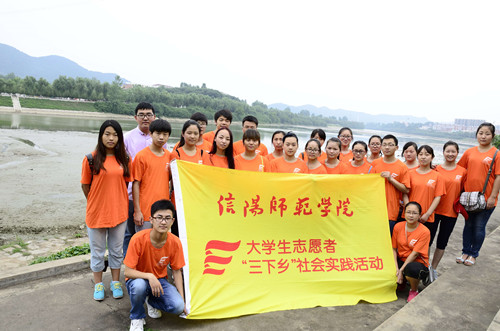 暑期社会实践团顶着烈日,在团总支老师路振国的带领下,前往浉河沿岸进行水质调查。