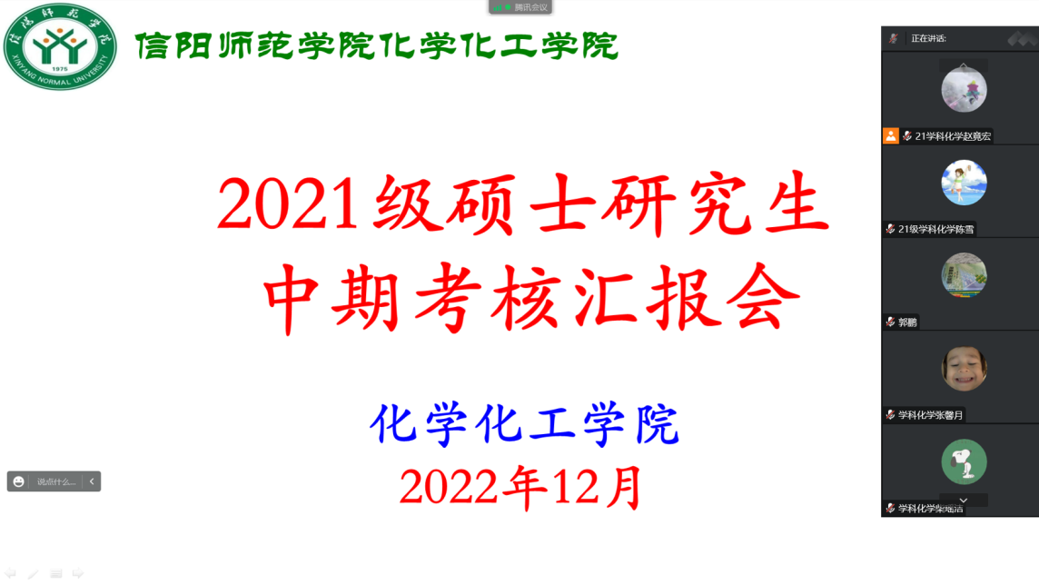根据学校《关于做好2022-2023学年第一学期末研究生培养工作的通知》与《信阳师范学院硕士研究生培养工作暂行规定》的总体安排,12月13日,成人小说 通过腾讯会议在线上举行2023届毕业教育硕士研究生中期考核汇报。考核组专家由刘德汞、郭鹏、王红军、朱建君、王玲玲、赵明等老师组成,汇告会由郭鹏主持。该专业全体研究生参会观摩学习。