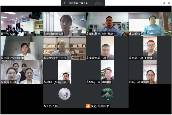 本次硕士研究生学位论文答辩会分3个小组进行,第一组包含学科教学(化学)专业硕士研究生7人,第二组包含无机化学、物理化学及有机化学方向硕士研究生8人,第三组为分析化学方向硕士研究生6人。第一组邀请息县一高中学正高级教师赵明主任担任答辩主席,华中师范大学王世存副教授,刘德汞郭鹏王玲玲王红军、朱建君等校内导师担任答辩委员。第二组邀请了河南大学牛景杨教授担任答辩主席,井强山、刘鹏、樊阳曹新华、饶伟浩、唐林、姜勇等校内导师担任答辩委员;第三组邀请了郑州大学屈凌波教授担任答辩主席,黄淮学院刘彦明教授,曹俊涛甘甜许婧、何梦媛等校内外导师担任答辩委员。