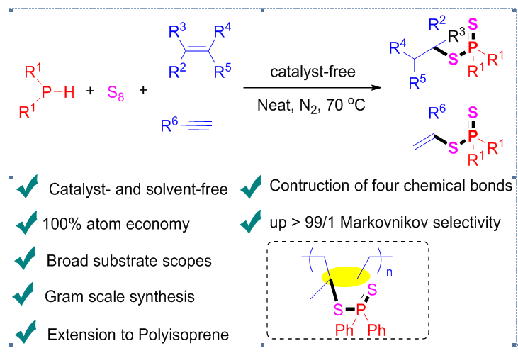 马献涛副教授课题组在绿色化学领域权威期刊《Green Chemistry》上发表了题为“Catalyst- and solvent-free, atom and step economic synthesis of dithiophosphinates by one-pot domino introduction of sulfur atoms strategy”(DOI: 10.1039/D5GC00821B)的研究论文。该工作发展了一种无催化剂、无溶剂条件下的多米诺多组分反应新策略,实现了二苯基膦、单质硫(S₈)与烯烃/炔烃的高效绿色转化,提供了一种原子和步骤经济性合成烷基二硫代膦化物的新方法。
