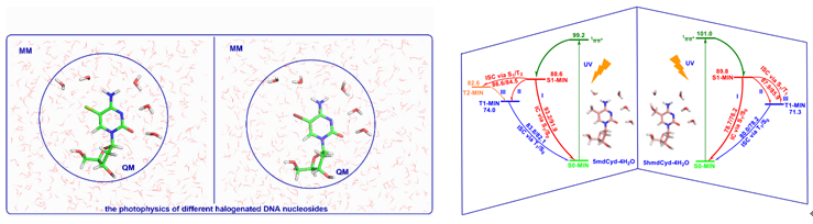 常雪萍副教授课题组先后在期刊《Physical Chemistry Chemical Physics》和《The Journal of Physical Chemistry A》上分别发表了题为“Quantum mechanics/molecular mechanics studies on mechanistic photophysics of epigenetic C5-halogenated DNA nucleosides: 2′-deoxy-5-chlorocytidine and 2′-deoxy-5-bromocytidine in aqueous solution”、“Quantum Mechanics/Molecular Mechanics Studies on the Excited-State Relaxation Mechanisms of Cytidine Analogues: 2′-Deoxy-5-Methylcytidine and 2′-Deoxy-5-Hydroxymethylcytidine in Aqueous Solution”(DOI:10.1039/d4cp04574b; 10.1021/acs.jpca.4c08520)的研究成果。两项研究先后采用 QM(CASPT2//CASSCF)/MM理论方法计算研究了四种重要的2-脱氧-5-取代的胞苷类似物,即5-卤/溴胞苷(5CldCyd/5BrdCyd)和5-甲基/羟甲基胞苷(5mdCyd/5hmdCyd)在水溶液中的光物理机制,合理解释了其在水溶液中的激发态光动力学行为,为理解类似结构修饰DNA核苷及其衍生物的光物理和光化学机制提供了重要的机理见解。