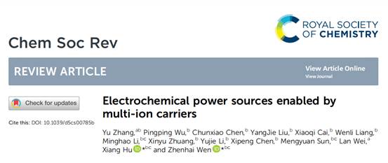 张钰博士在国际化学领域顶级综述期刊Chemical Society Reviews(影响因子40.4)上发表了题为“Electrochemical power sources enabled by multi-ion carriers”的重要论文,系统阐述了多离子载体电化学能源技术的前沿进展与未来展望,我校为第一单位,张钰博士为第一作者。
