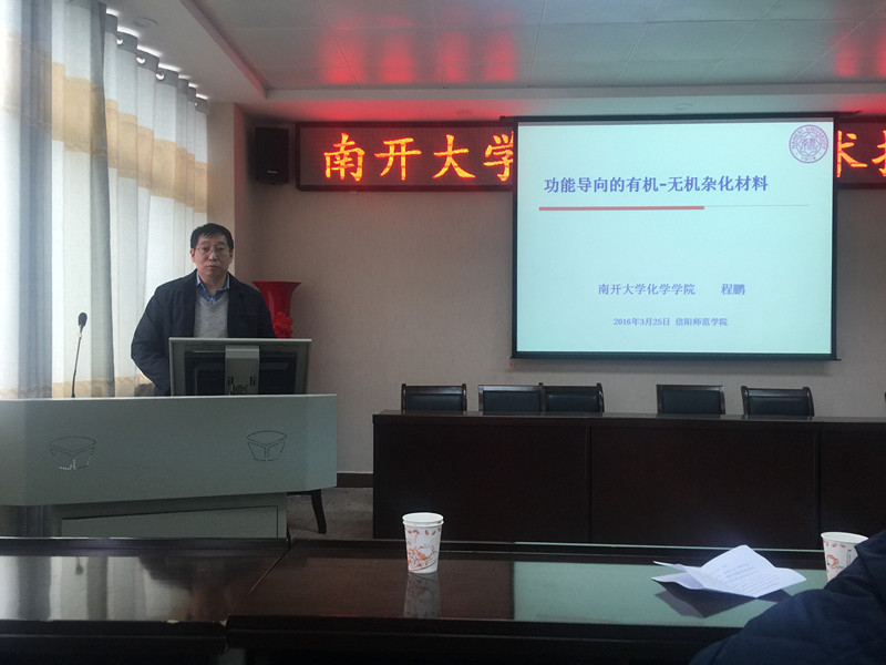 学术报告厅作了题为“功能导向的有机-无机杂化材料”的学术报告。信阳师范学院副院长刘彦明出席并主持了报告会。参加报告会的还有化院院长杨性坤教授、副院长井强山教授以及学院的青年教师和全体研究生。