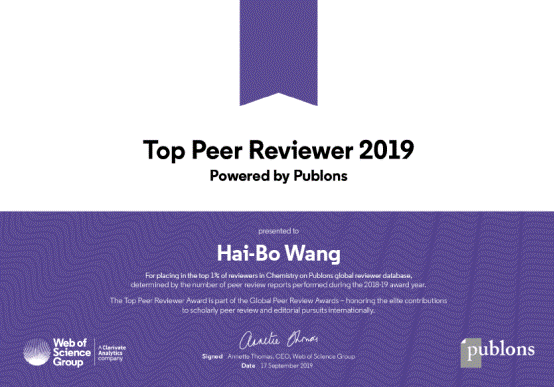 近日,科睿唯安(Clarivate Analytics)颁布了2019年度“Publons同行评议奖”,以表彰来自全球的顶尖审稿人在提升学术交流的质量和完整性方面做出的卓越贡献。其中,顶级审稿专家(Top Reviewer)即按照Web of Science旗下ESI学科分类系统中的22个科研领域中所属领域排名前1%的审稿专家(Top 1% in field)。我校成人小说