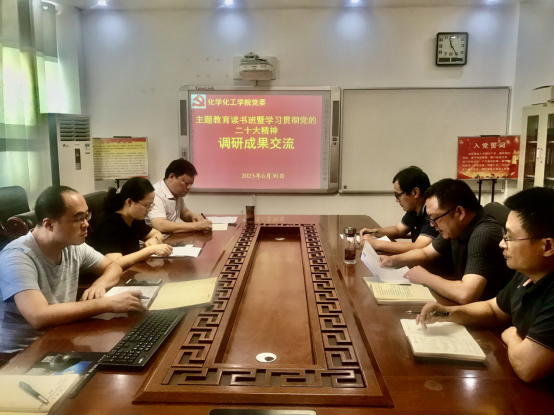 在化学楼313会议室开展学习贯彻习近平新时代中国特色社会主义思想主题教育调研成果交流会。学院全体领导班子进行研讨总结,由党委书记郭鹏主持。