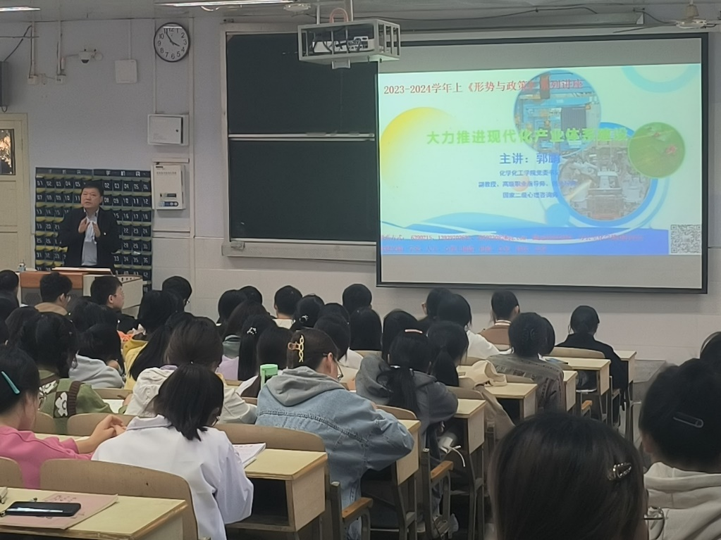 党委书记郭鹏带头深入学生班级开讲2023-2024学年上学期《形势与政策》专题讲座,宣讲形势与政策知识,为所分包联系的2023级化学本科班青年学生集中解读《习近平新时代中国特色社会主义思想概论》有关内容知识。