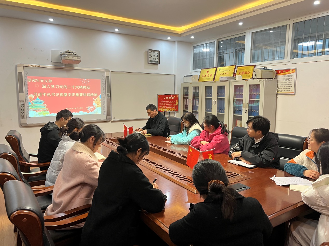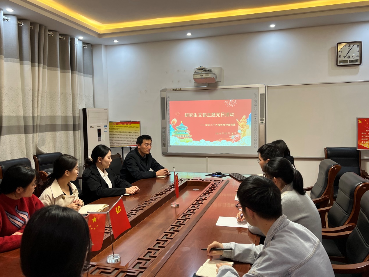 研究生支部书记马献涛强调,要认真学习领会党的二十大报告,习近平总书记所作的报告高瞻远瞩、举旗定向、气势磅礴,是动员全党全国各族人民坚持和发展中国特色社会主义、全面建设社会主义现代化国家、全面推进中华民族伟大复兴的政治宣言和行动纲领,给人以信仰的感召、奋斗的意志和前行的力量。新时代十年,以习近平同志为核心的党中央不断把中国式现代化推向前进,实现中华民族伟大复兴进入了不可逆转的历史进程。我们要踔厉奋发、勇毅前行,为全面建设社会主义现代化国家、全面推进中华民族伟大复兴而团结奋斗。