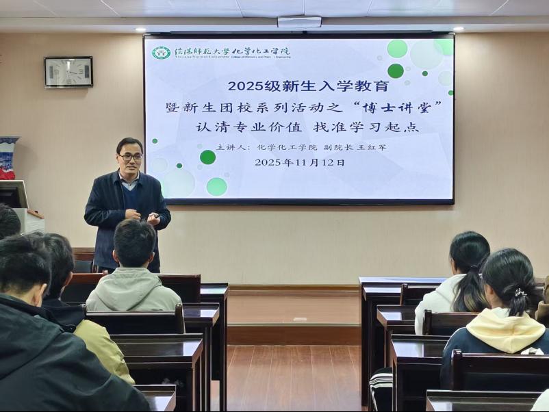 11月12日,成人小说 在化学楼407开展2025级新生入学教育暨新生团校系列活动之“博士讲堂”,成人小说 副院长王红军主讲,学院团委书记赵方方主持,2025级化学工程与工艺专业新生参与。