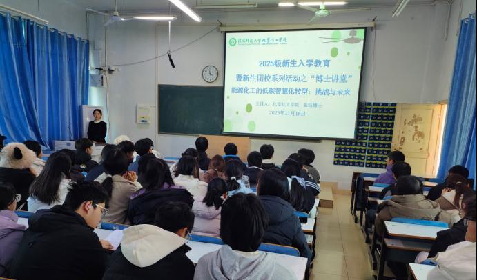 张钰博士主讲,学院团委书记赵方方主持,2025级应用化学、材料化学专业新生参与。