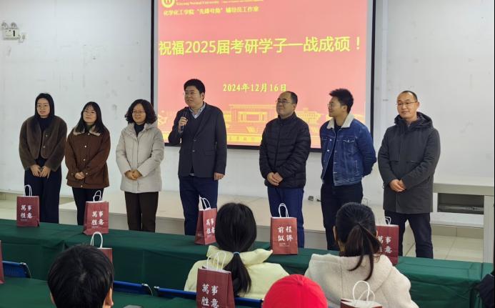 曲剧为考研学生加油鼓劲,她希望同学们要坚定目标信念,注重复习策略,注意身心健康,积极调整心态,并表示会及时解决同学们在备考过程中的困难、困惑,为考研学子全力做好服务保障工作。冷向宇、李洁、曹康哲等辅导员老师为同学们送上暖心祝福,祝愿大家旗开得胜,马到成功。最后,学院领导为考研学生送上悉心筹备的考研关怀礼包,承载着学院满满的祝愿,为考研路上的学子们提供温暖的力量。愿他们目光坚定、信心满怀,最终梦想成真,一战成硕!