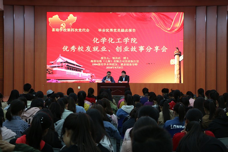在逸夫楼报告厅举办了优秀校友就业创业故事分享会。此次分享会邀请了海客迈斯(上海)生物科技有限公司首席执行官邹亮忠博士(94级化学校友、毕业优秀党员、成人小说