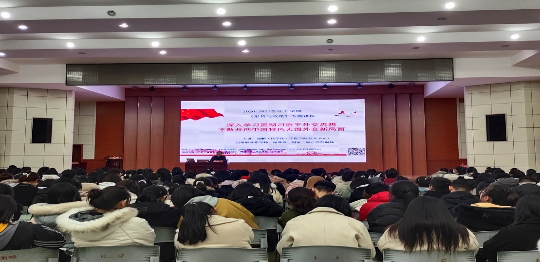 党委书记郭鹏在逸夫楼报告厅为学生党员、团学干部、各班团负责人、2020级全体作“深入学习习近平外交思想”专题《形势与政策》讲座。