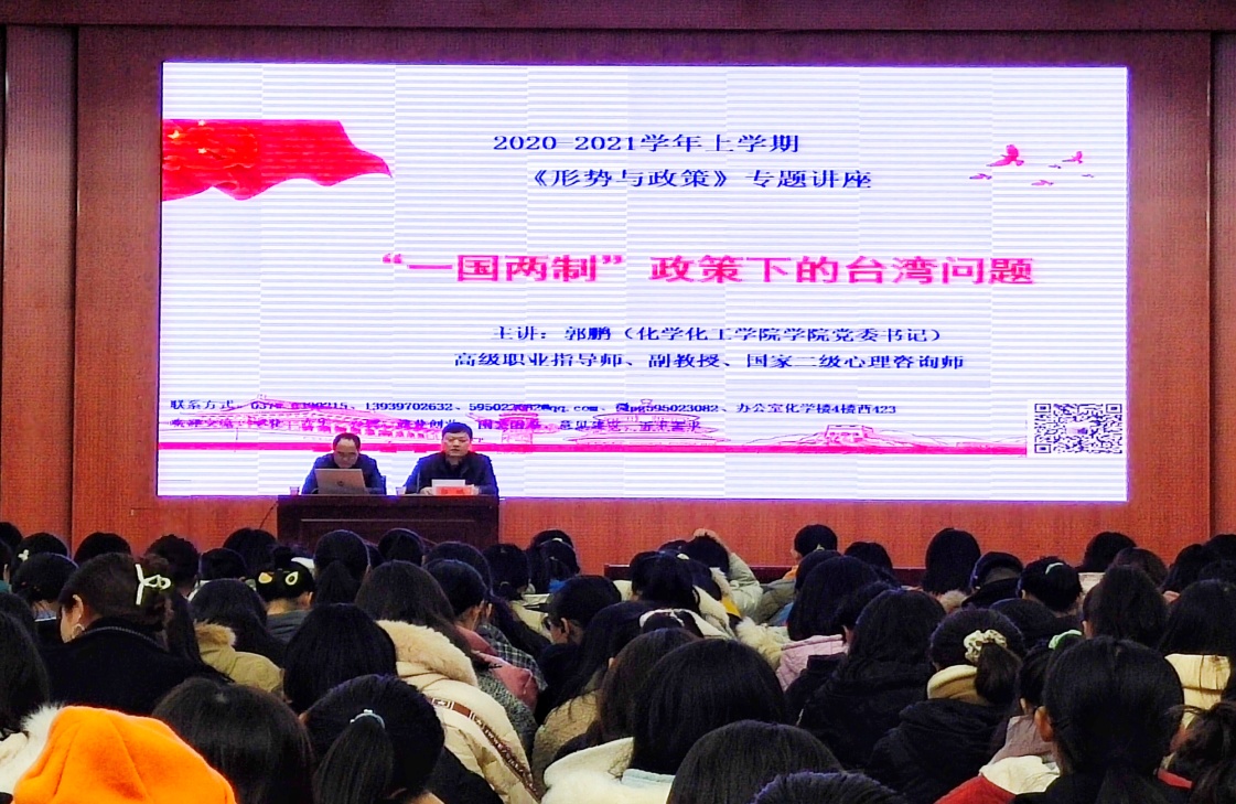 党委书记郭鹏在逸夫楼报告厅为2020级全体学生作“一国两制”政策下的台湾问题---《形势与政策》专题讲座。讲座由专职组织员冷向宇主持。