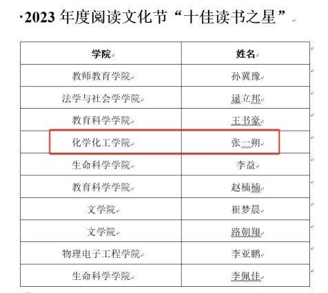 读者入馆人次位居第二,读者借阅图书册数和人均借阅册数位居全校前列,荣获2023年书香校园建设“十佳单位”。此外,2022级化学专业学生张一朔位居全校年度外借图书册数第四,被评为“十佳读书之星”。