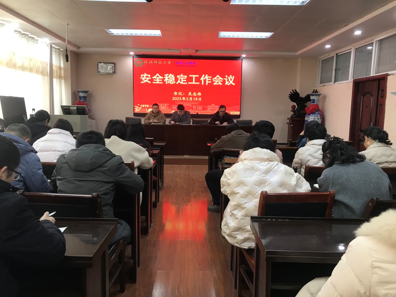 在实验楼407会议室召开2025年春季安全稳定工作会议。学院党委书记吴志伟主持会议,全体教职工参加会议。