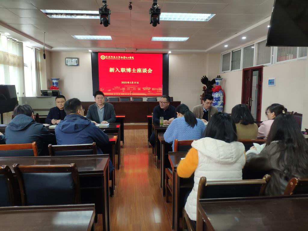在化学楼407会议室召开新入职博士座谈会,党委书记吴志伟、院长曹俊涛等领导班子与9名新进博士教师共话科研教学发展需求。会议由曹俊涛主持。