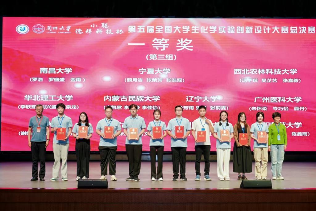 遴选的参赛队伍(陈思帆、苏盈盈、陈鑫雨,指导教师:马献涛副教授、曹俊涛教授)凭借扎实的专业功底、出色的创新能力与稳定的现场发挥,沉着应战,奋勇拼搏,最终从众多参赛队伍中脱颖而出,喜获全国总决赛一等奖。这也是继2023年马献涛博士指导团队指导学生获得第三届全国大学生化学实验创新设计竞赛一等奖后取得的又一项国家级一等奖励。这不仅是对我校学子实验创新能力与实践水平的高度认可,更彰显了我校在化学学科教学、科研创新培养体系上的持续深耕与显著成效。