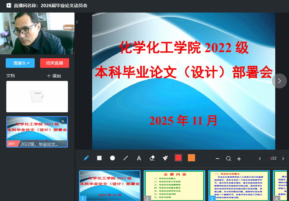 2026届本科毕业论文(设计)工作顺利开展,同时充分考虑到毕业生正在各地进行教育实践活动,11月18日下午,学院通过超星直播平台举行了2022级本科毕业论文(设计)动员会,教学副院长王红军主持会议,2022级全体本科毕业生同步在线参会。