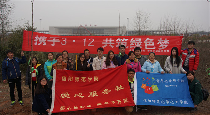 青年化学研习社“携手3·12,共筑绿色梦”义务植树活动于信阳高铁站率先启动。在化院团委老师路振国的带领下,志愿者携带劳动工具与待栽树苗前往目的地,用双手栽下遍地绿色,以行动践行环保理念。青春携手、彰显环保之志――贤山环保之旅随即于3月13日由爱心服务社组织开展。此次赴贤山为环保助力活动旨在深化文明出行意识,为建设文明信阳打下基础。凝聚爱心,传递温暖,3月19日,爱心服务社携手特殊教育学校聋哑学生为浉河整理仪容,结伴同游南湾湖。由成人小说