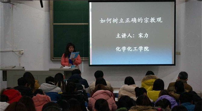 于教四梯一开展学生安全及宗教知识讲座。党总支副书记宋力主讲。辅导员老师孙俊永、路振国、李中杰与150余名学生共同参加。
