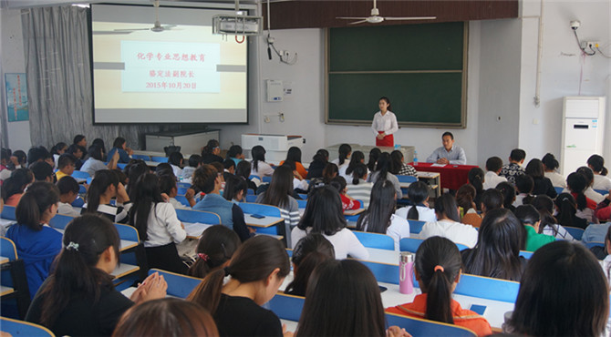 于教四梯二隆重召开化学专业思想教育座谈会,副院长骆定法受邀担任主讲,一百四十余名新生参加本次座谈会。