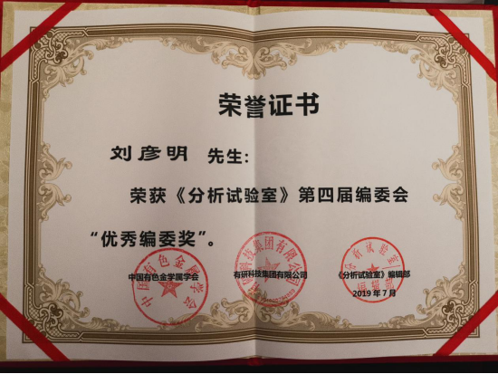 刘彦明教授荣获《分析试验室》第四届编委会“优秀编委奖”,并被续聘为该刊第五届编委。期刊名誉主编、中国工程院屠海令院士为四位获奖编委进行了颁奖。