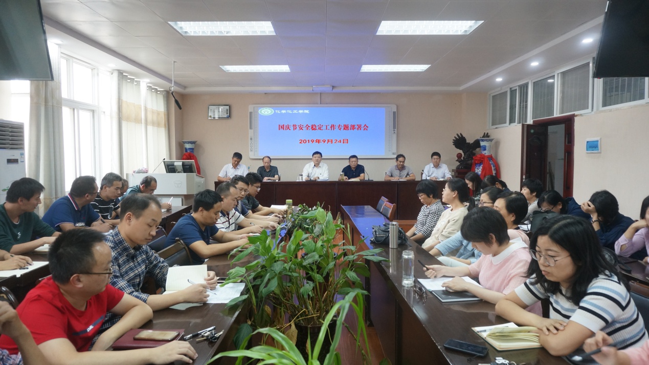 会议强调,要重点加强对科研实验室的安全防控与有效管理,并对在校学生思想状况、意识形态及宗教问题进行通报,动员全体教师深入学生,尤其要关切新生的各类安全教育与自我管理。会议要求,加强对国庆假期值班周密安排、对师生离返校进行严格的登记报备。会议统一思想,明确一把手担负主体责任、分管领导坚持“一岗双责”、具体责任人负主要直接责任,要分工负责、全面管控,确保新中国成立70周年大庆期间学院各项工作一切平稳顺利。