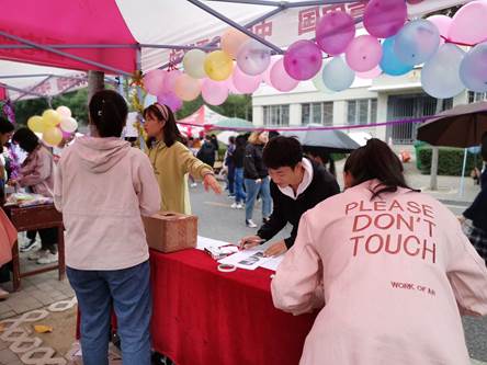辅导员老师赵方方前来参观活动现场,并融入其中和同学们亲切互动。