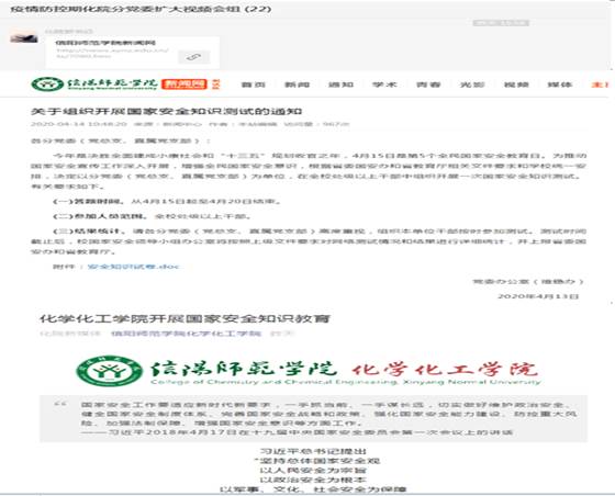 415日,结合第五个国家安全教育日主题,按照上级党组织和学校党委《关于组织开展国家安全知识测试的通知》《关于组织收看国家安全典型案例专题宣传片的通知》等要求,成人小说 分党委结合新冠肺炎疫情防控、开学复学准备工作实际,通过多种形式、多种渠道,及时开展了师生专题学习教育活动,积极营造了共筑国家安全人民防线的浓厚氛围。