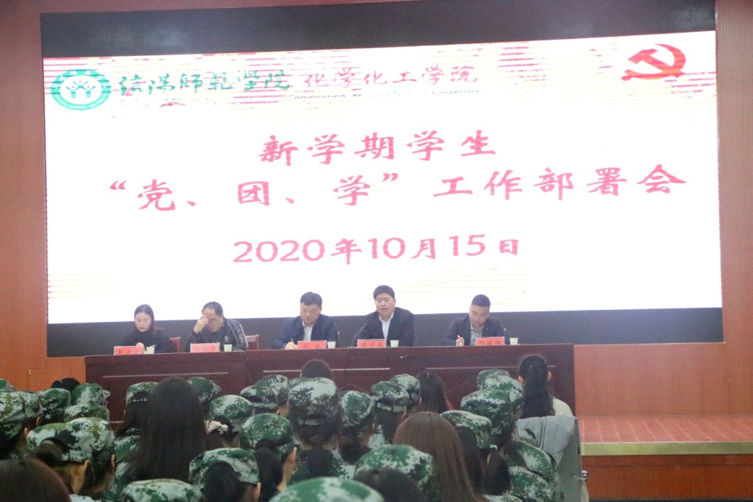 在逸夫楼报告厅召开新学期党、团、学工作部署会。学院党委书记郭鹏、副书记吴志伟、分团委、学工办全体成员出席会议,全体学生党员、团委学生会社团干部、全体新生一起参加了会议,会议由团委书记邓耀辉主持。