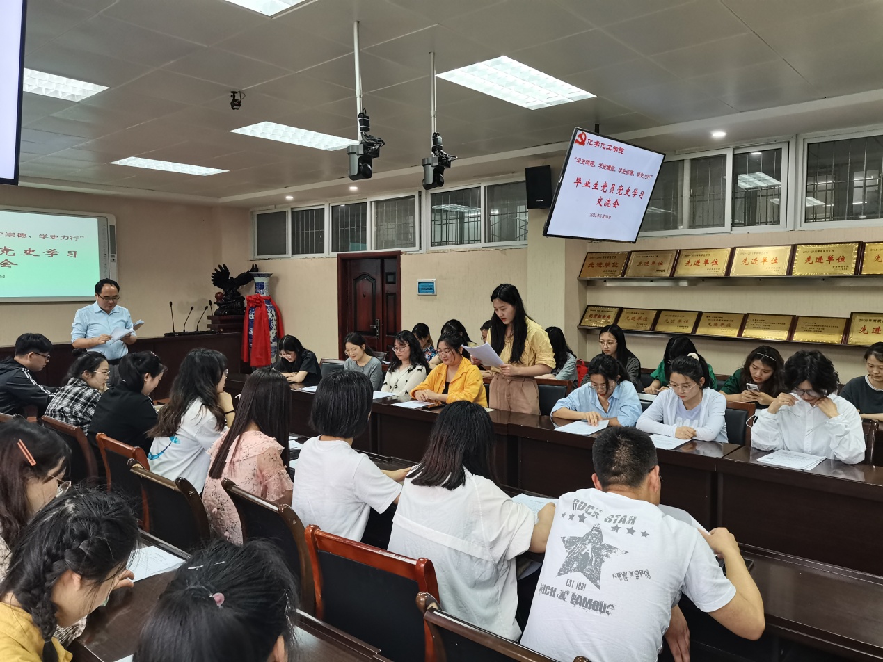 学生党员自主开展了学习《中国共产党简史》。毕业生党员李梦瑶发言:“红船的罗盘始终对准着—太阳升起的地方”;“焦裕禄在兰考担任县委书记时所表现出来的‘亲民爱民、艰苦奋斗、科学求实、迎难而上、无私奉献’的精神,被后人称之为‘焦裕禄精神’”;“大批优秀的科技工作者,包括许多在国外已经有杰出成就的科学家,以身许国,怀着对新中国的满腔热爱,响应党和国家的召唤,义无反顾地投身到‘两弹一星’这一神圣而伟大的事业中来。”这些精神跨越时空,历久弥新。毕业生党员邓椿侠分享学习党史心得:她从新民主主义革命开始到社会主义建设到改革开放,学习了中国共产党发展的艰辛历程,中国共产党始终坚持一步一个脚印,在艰辛探索中前行,在与时俱进中革新,最终成功走上了中国特色社会主义道路。学生党员高琰美分享了对于井冈山精神的认识,指出井冈山革命精神不管是在革命时期还是在当今社会,都是引导中国更好的走向未来的宝贵精神,认为进入新时代,我们更是要传承和发扬先辈们的红色革命精神,在进行伟大斗争的新征程进一步坚定信念,百折不挠、砥砺前行。“看历史,就会看到前途。”学习重温中国共产党百年历史,党员更应该坚定中国共产党历史自信,坚定中国人民和中华民族未来自信。毕业生党员们畅所欲言,表达对学院对老师的感恩、感激之情。