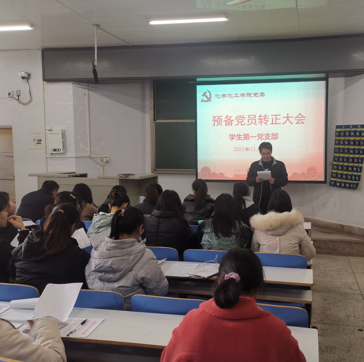 学生第一支部在教四楼T1室召开预备党员转正大会,学生第一支部7名正式党员和19名预备党员参加本次大会,其中有8名预备党员转为正式党员。党支部书记冷向宇参加会议。