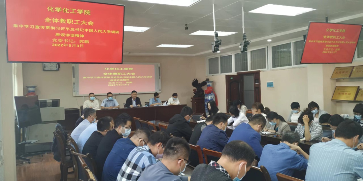 召开全体教师大会,专题学习传达贯彻习近平总书记在中国人民大学考察时的重要讲话精神。学习活动由党委书记郭鹏主持,全体教职员工参加了学习活动。