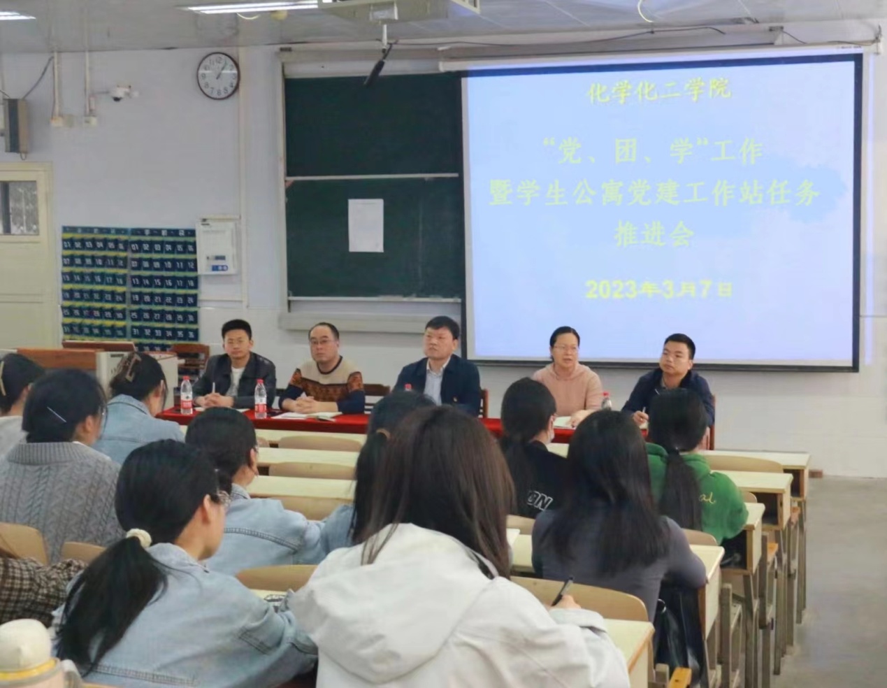 在教六102专门召开2022-2023学年下学期“党、团、学暨学生公寓党建工作推进会”。学院党委书记郭鹏、副书记曲剧、专职组织员冷向宇,辅导员邓耀辉、严赫等出席大会,全体学生党员、学生干部参加会议。