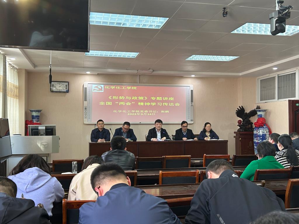 全体教职工在化学实验楼407报告厅开展《学习传达全国“两会”精神》形势政策学习。形式政策课由党委书记郭鹏主讲。