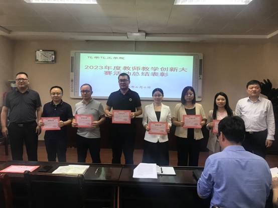 副院长王红军宣布了2023年度教师教学创新大赛一、二等奖的教师名单。在热烈的掌声中,学院党委书记郭鹏、副院长曹俊涛向获奖教师颁发证书,并合影留念。