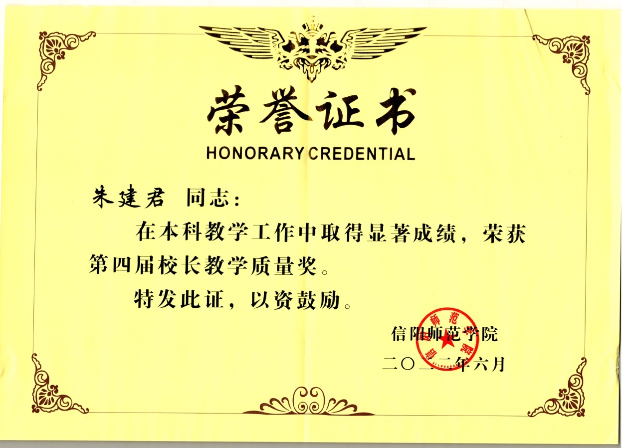 2022年6月,信阳师范学院发布《关于公布第四届校长教学质量奖评选结果的通知》,经个人申报、学院推荐、资格审查、学校初评、学校终评、学校公示、校长办公会议审议等严格程序,全校评选出10名教师为第四届“校长教学质量”奖获得者。成人小说 教师朱建君博士荣获信阳师范学院第四届“校长教学质量奖”。(成人小说 教学办供稿 王红军 冷向宇审稿 郭鹏审核)