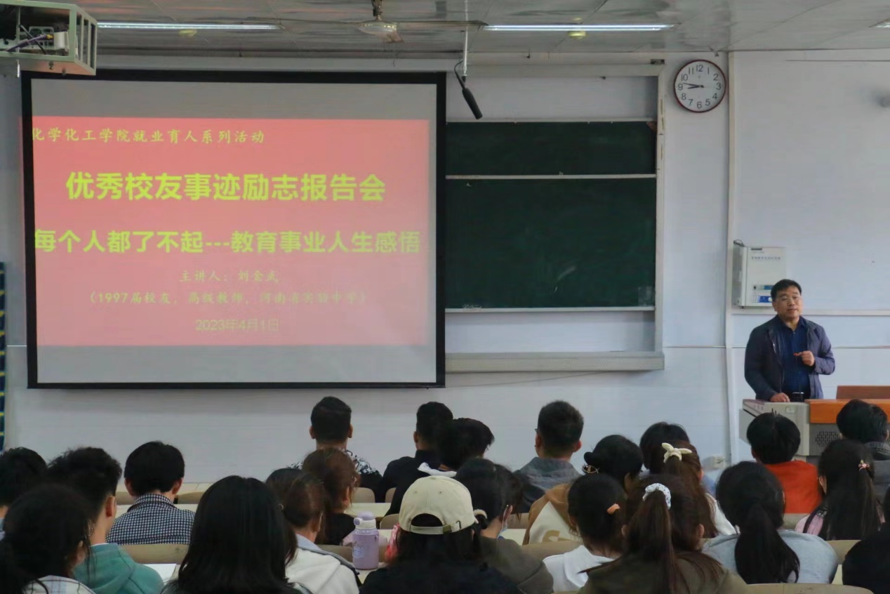 报告会上,刘金武结合自身求学、就业、教书、育人、援疆等丰富经历,为在校大学生讲解了化学师范专业人才培养、中学教育事业发展、毕业生就业创业形势、教师职业晋升前景,强调了化学师范专业人才培养重要性,以及基础教育事业发展趋势、教师队伍师资人才需求。他着重介绍一名教师如何备好课、授好课,成长名师,如何做好班主任、年级管理等工作,成就事业。他鼓励学生们要在大学四年生活中注重打牢专业知识基础,练就师范技能基本功,做好就业准备,练就职业技能,在日常学习生活中,要明确目标、谦虚谨慎、努力奋斗。并与学生分享教育工作宝贵经验:一是教育事业需要投入真爱、全身心的爱,二是要做好学业和职业规划,及早立志投身教学育人事业;三是要积极适应社会,坚持做好一件事,用大爱回报社会。